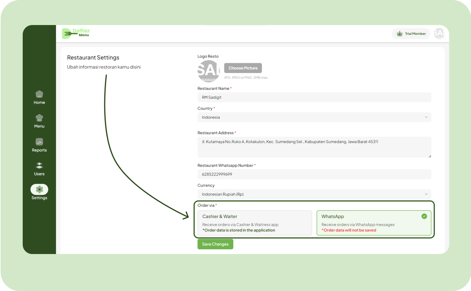 If you've already upgraded your account to premium, you can choose your ordering method through WhatsApp or the Cashier & Waiters App.